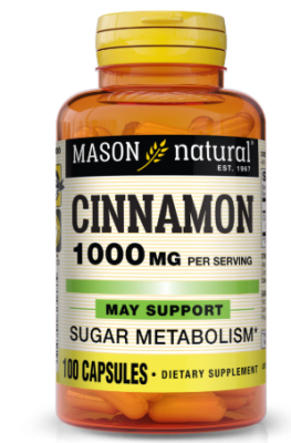 Mason Natural Cinnamon 1000 mg is a dietary supplement that supports heart health, circulation, and overall wellness. Each gluten-free capsule contains 1000 mg of cinnamon with no added sugars, starch, or preservatives.